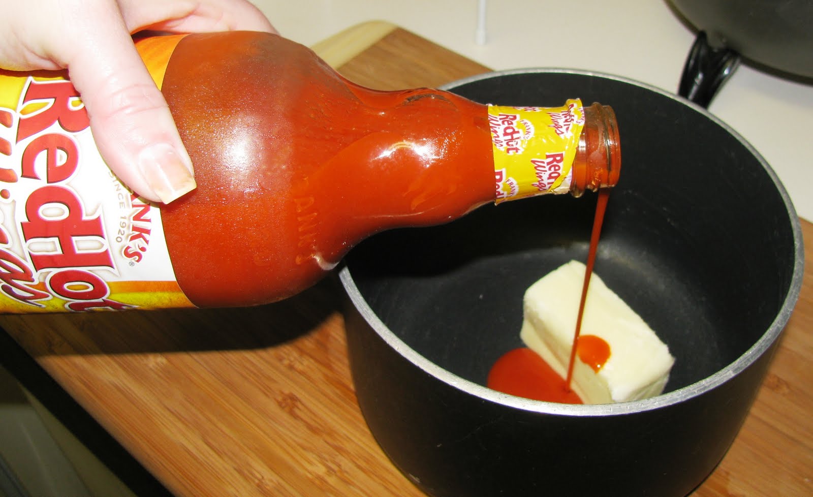 - In small sauce pan add butter and hot sauce and cook until heated through.